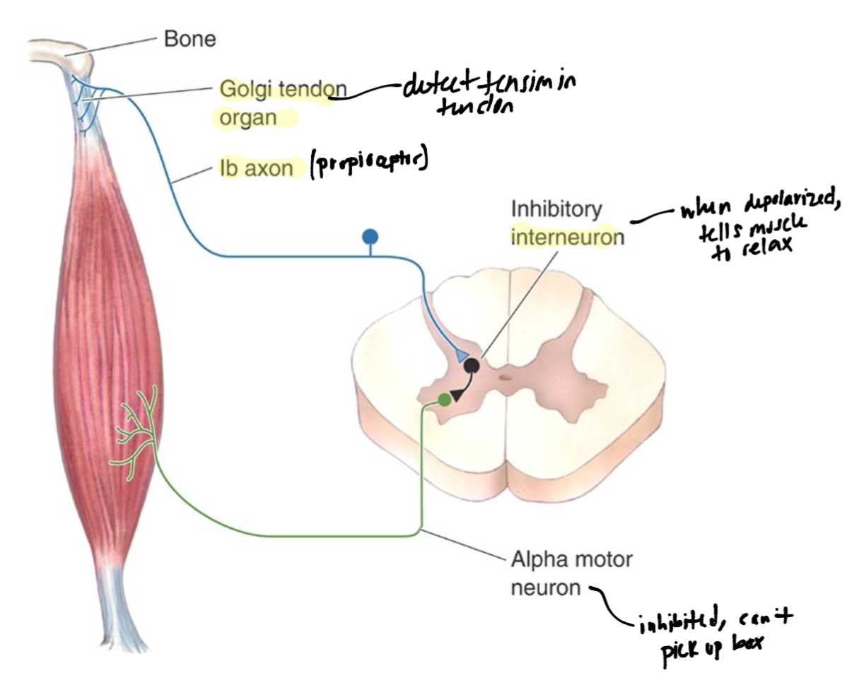 ex. box is way heavier than we think, we feel tension in tendons which connect muscle to bone (can’t risk damage here), muscles give up and drop it
