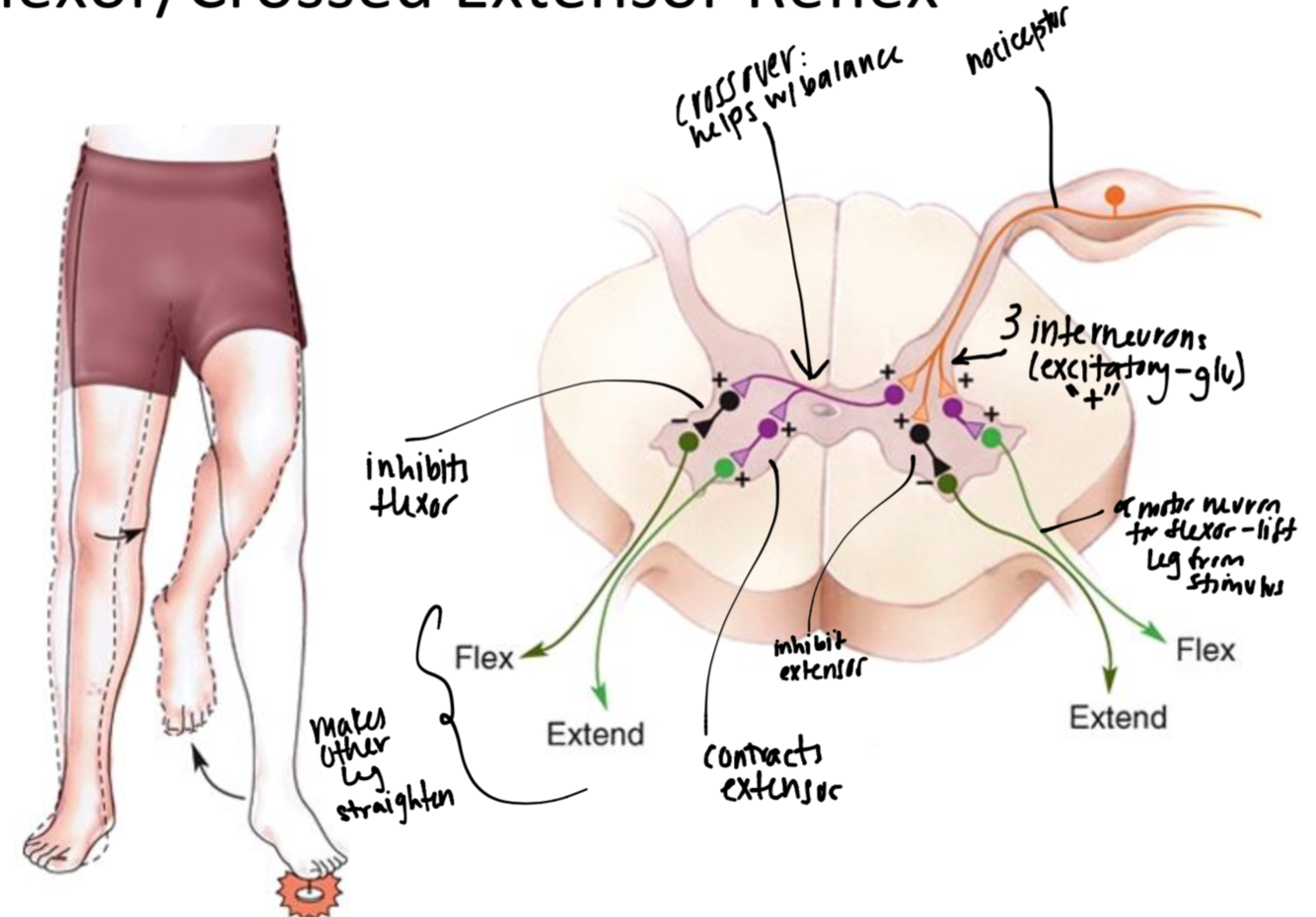 removes limb from noxious stimulus (flexor) and maintains balance (crossed extensor), nociceptor input