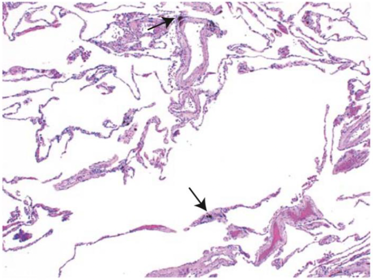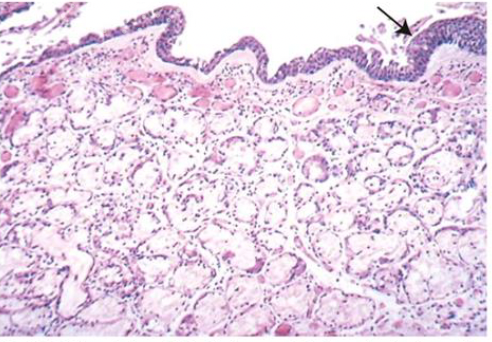 -Bronchite chronique. On remarque l’épaississement marqué de la couche muqueuse (environ deux fois la normale) et la métaplasie squameuse de l’épithélium pulmonaire (flèche noire).