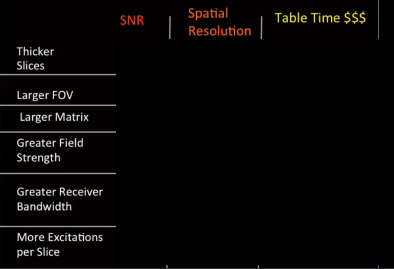 small matrix, large FOV, thicker slicer, stronger field strength, smaller surface coils, more excitations (longer TR, shorter TE), narrow receiver bandwidth