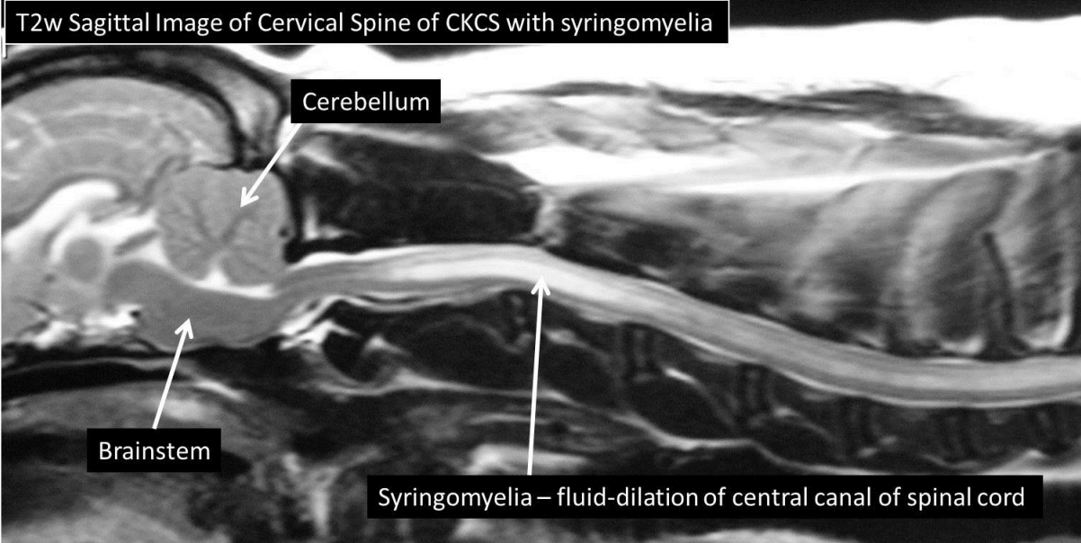 associated with Chiari-like malformation –> undeveloped caudal fossa of the skull causing compression of the cerebellum and forcing CSF along the central canal of the spinal cord rather than subarachnoid space –> causes dilation of central canal and distortion of the spinal cord