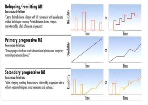 Kliniskt blir patienten väsentligt förbättrad efter ett skov p.g.a. återbildningen av myelin. De reparerade nervtrådarna leder impulser sämre och är känsliga i sin funktion. De fungerar bl.a. dåligt i värme (feber, bastu osv.), vilket resulterar i så kallade pseudoskov. I progressiv fas finns inte de fokala inflammationshärdarna kvar utan sjukdomen är mer neurodegenerativ och i stället för skov blir det en mer smygande förstörelse av myelin och axon. Detta leder till störd signalöverföring, sänkt ledningshastighet och konduktionsblockad.