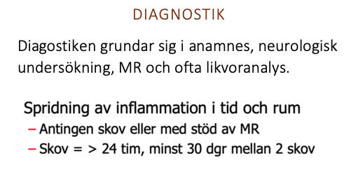 Man säger spridning i tid och rum. Där spridning i rum betyder att man behöver se minst en synlig lesion i minst två av de typiska lokalisationer för MS-plack.