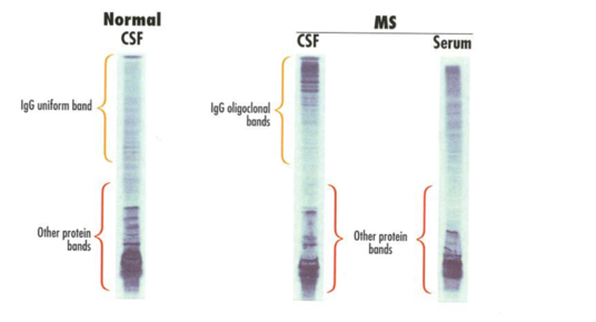 Man kontrollerar antikropapr och vid MS har man förhöjt IgG-index och/eller oligoklonala IgG-band. Man kan även se lätt albuminstering och för många lymfocyter (gräns på 5).