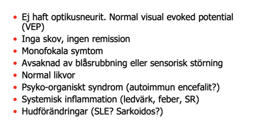 Även Neuromyelitis optika med ak mot aquaporin4 och MOG. Denna ger likade symtom som MS så man tar nummera ak MOG vid undersökning. Behandlas helt annorulunda och Natilizumab kan ge försärming i det.