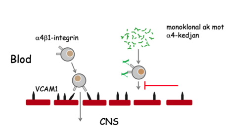 2:a linje: Natalizumab, så som Tysabri ges. Är en antikropp som påverkar alfa-4-kejan som binder till VCAM och förhindra migration av leuocyter. Kraftigare än Inferferon Beta, men biverkningar av PML då man aktiverar latenta JC-virus.