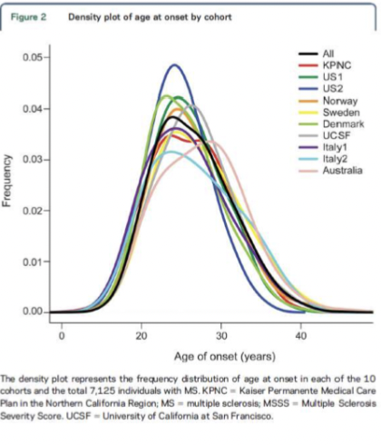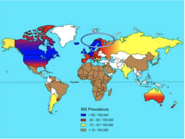Prevalensen av mutipple sklerose er lav rundt ekvator og øker med økende breddegrad