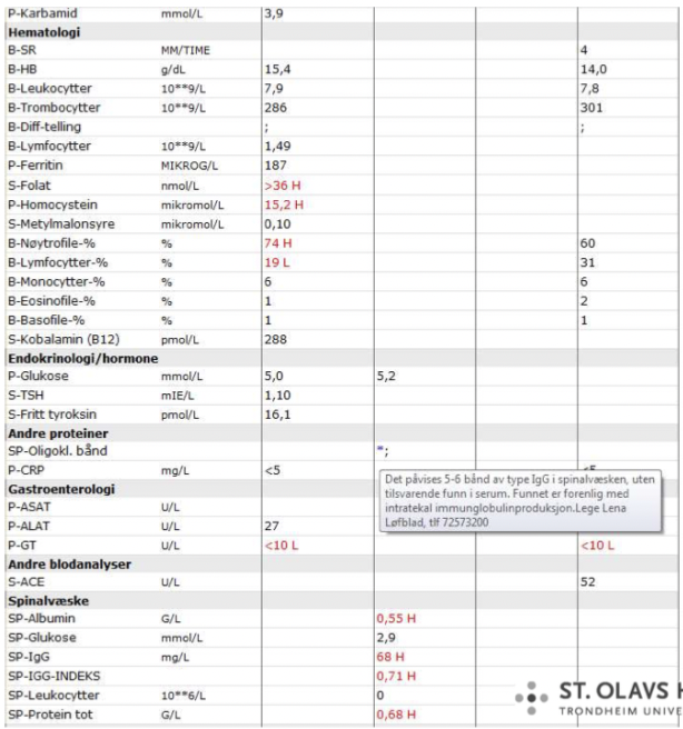 Hvilke prøvesvar vil man forvente ved MS?