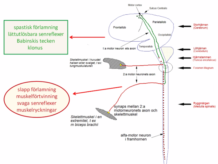 o Antalet fungerande neuroner minskar –> atrofi av hjärnan (även om skadan sitter i kortikospinala banor kan nervcellen atrofera och dö