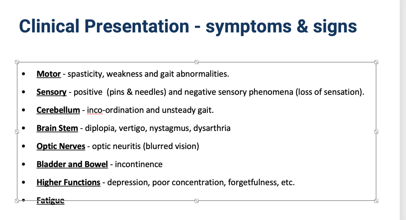 - During early stages, symptoms may completely remit. As diseases progresses likely to retain residual damage with each relapse.