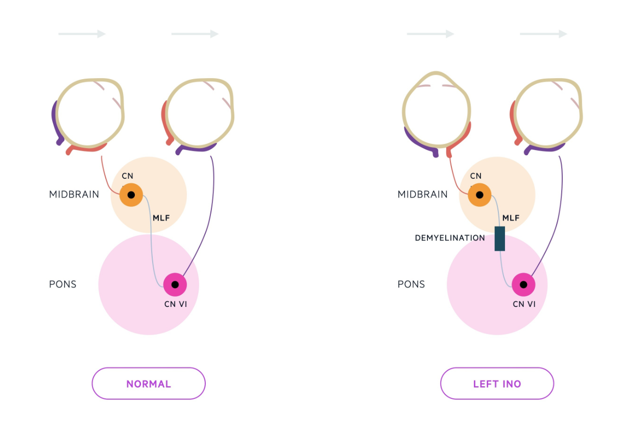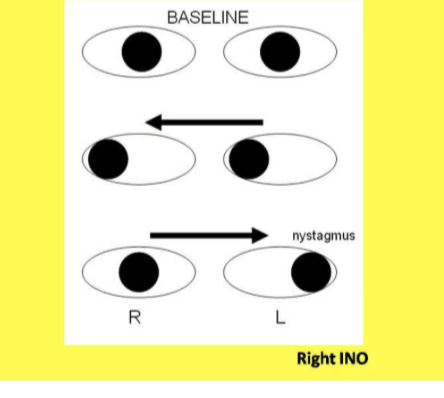 - Right INO - has adduction deficit associated with horizontal nystagmus on contralateral side