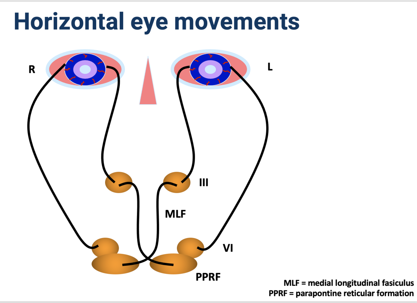 The nerve fibres of the medial longitudinal fasciculus connect the cranial nerve nuclei (“internuclear”) that control eye movements (the 3rd, 4th and 6th cranial nerve nuclei). These fibres are responsible for coordinating the eye movements to ensure the eyes move together.