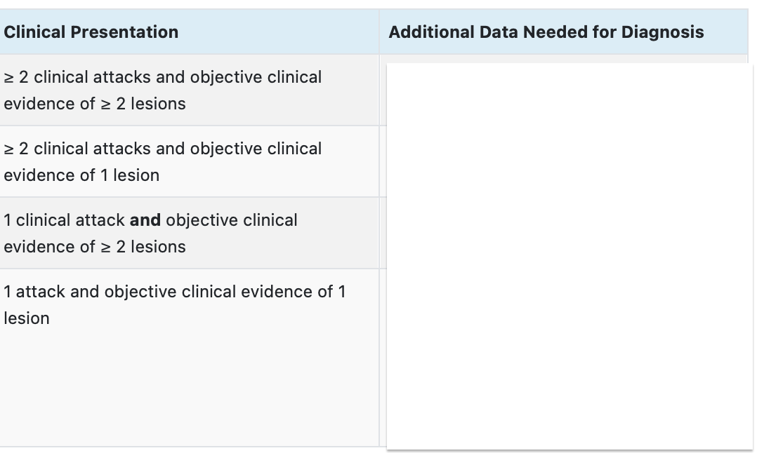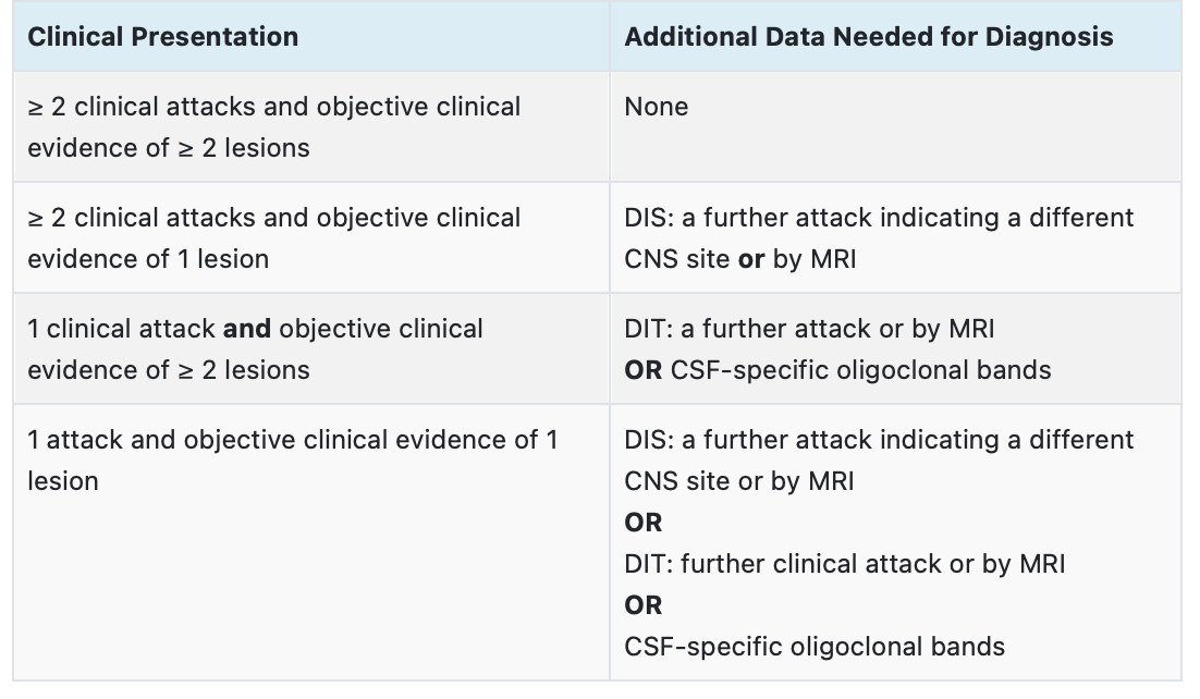 * ≥2 attacks but objective clinical evidence for only one lesion: evidence of dissemination in time, but not space. MS diagnosed if dissemination in space shown on MRI or subsequent clinical attack representing new area.