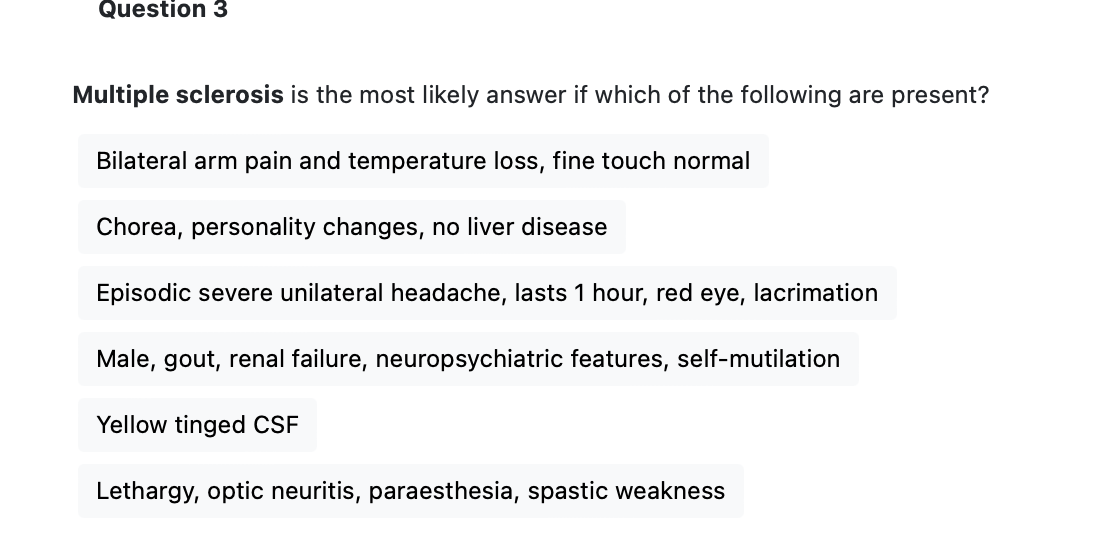 Lethargy, optic neuritis, paraesthesia, spastic weakness - multiple sclerosis