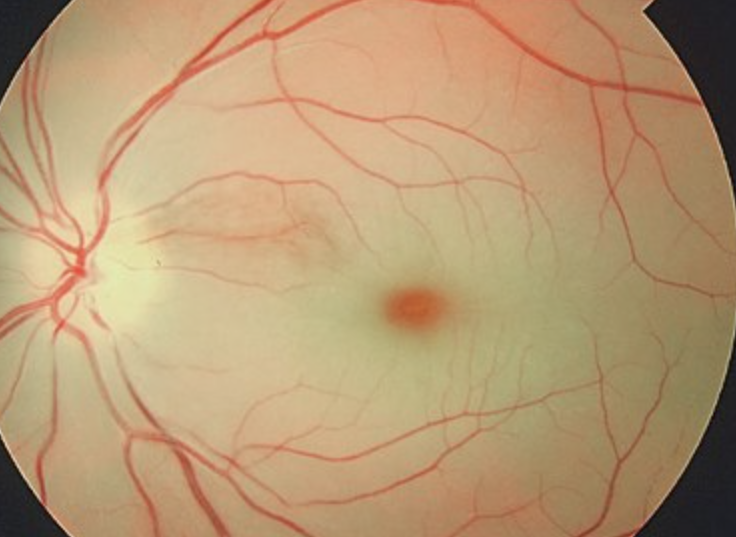 ‘Cherry red spot’: Suggestive macular sparing due to patent blood supply via the cilioretinal artery.