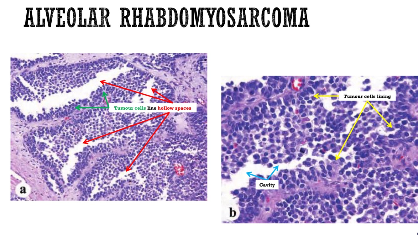 * Typical rhabdo-myoblasts with eccentric eosinophilic cytoplasm
