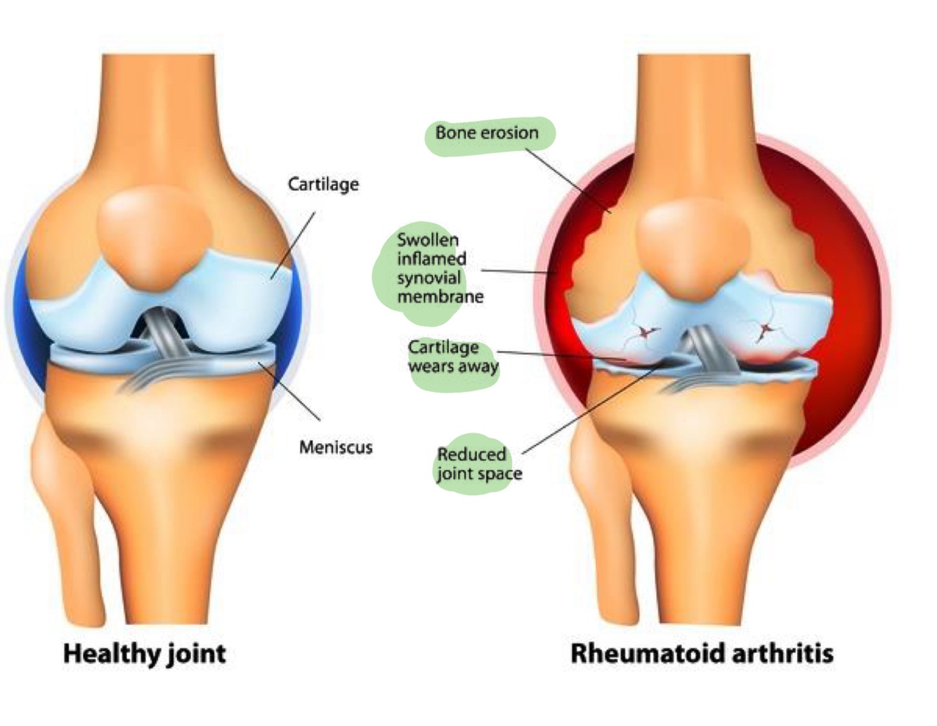 - Extension of pannus to sub-chondral bone → gradual erosions of bones and cartilage