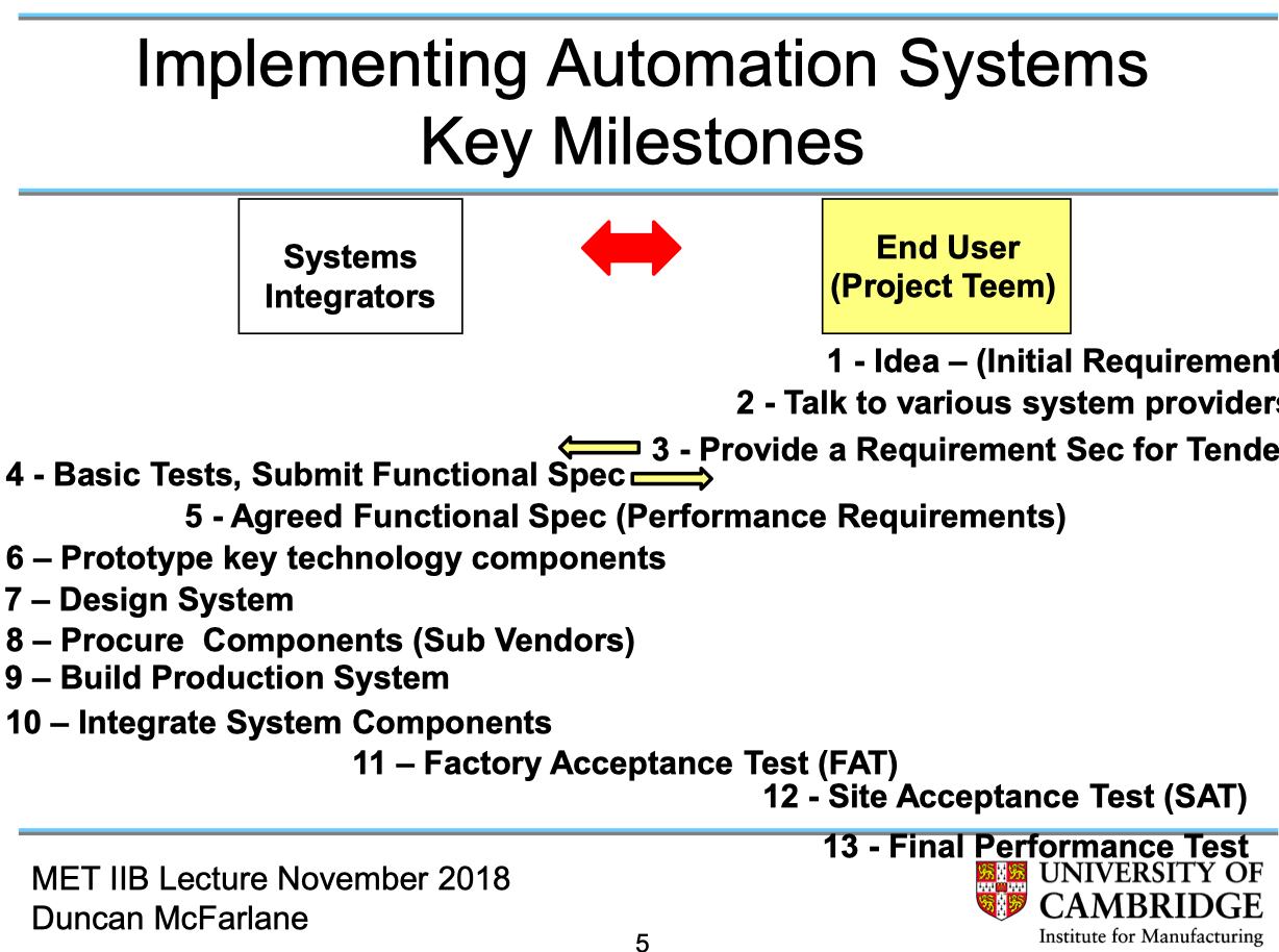 Project milestones that should be considered in the development, integration and delivery of a typical automation project: