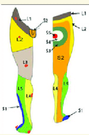Asymmetrical LL weakness (Dorsiflexion-L4, Plantar flexion-S1, Eversion-S1)