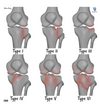 Low signal effusion on all sequences at MR is characteristic. There is no calcification or osteoporosis, and joint space narrowing is a late feature.