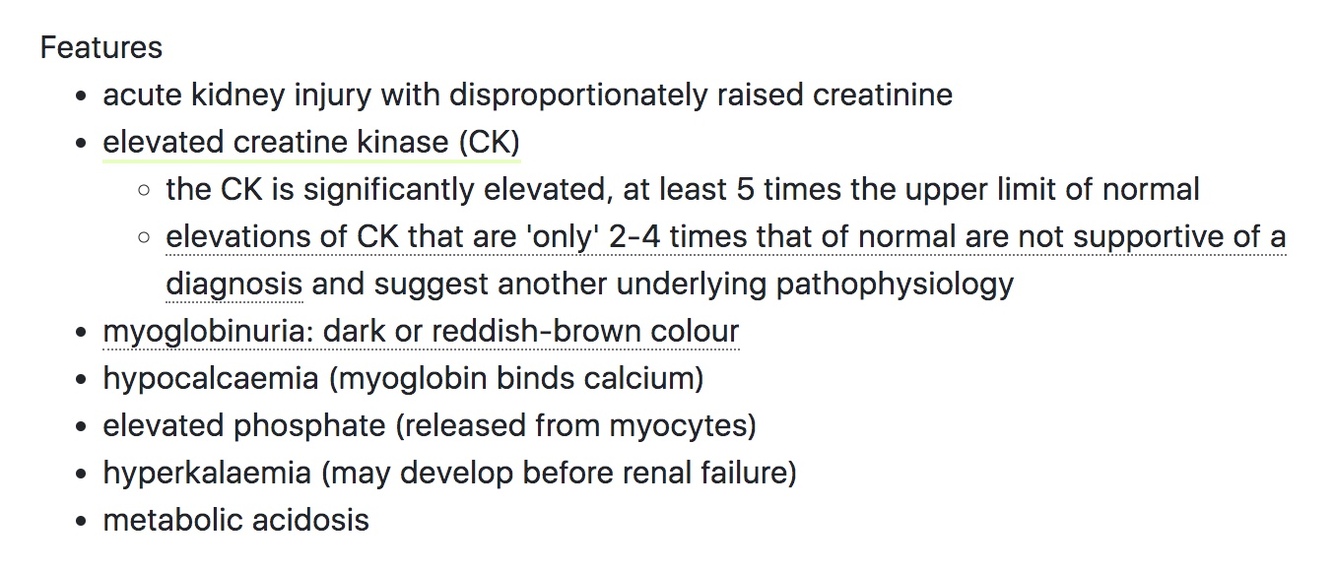 Rhabdomyolysis will typically feature in the exam as a patient who has had a fall or prolonged epileptic seizure and is found to have an acute kidney injury on admission.