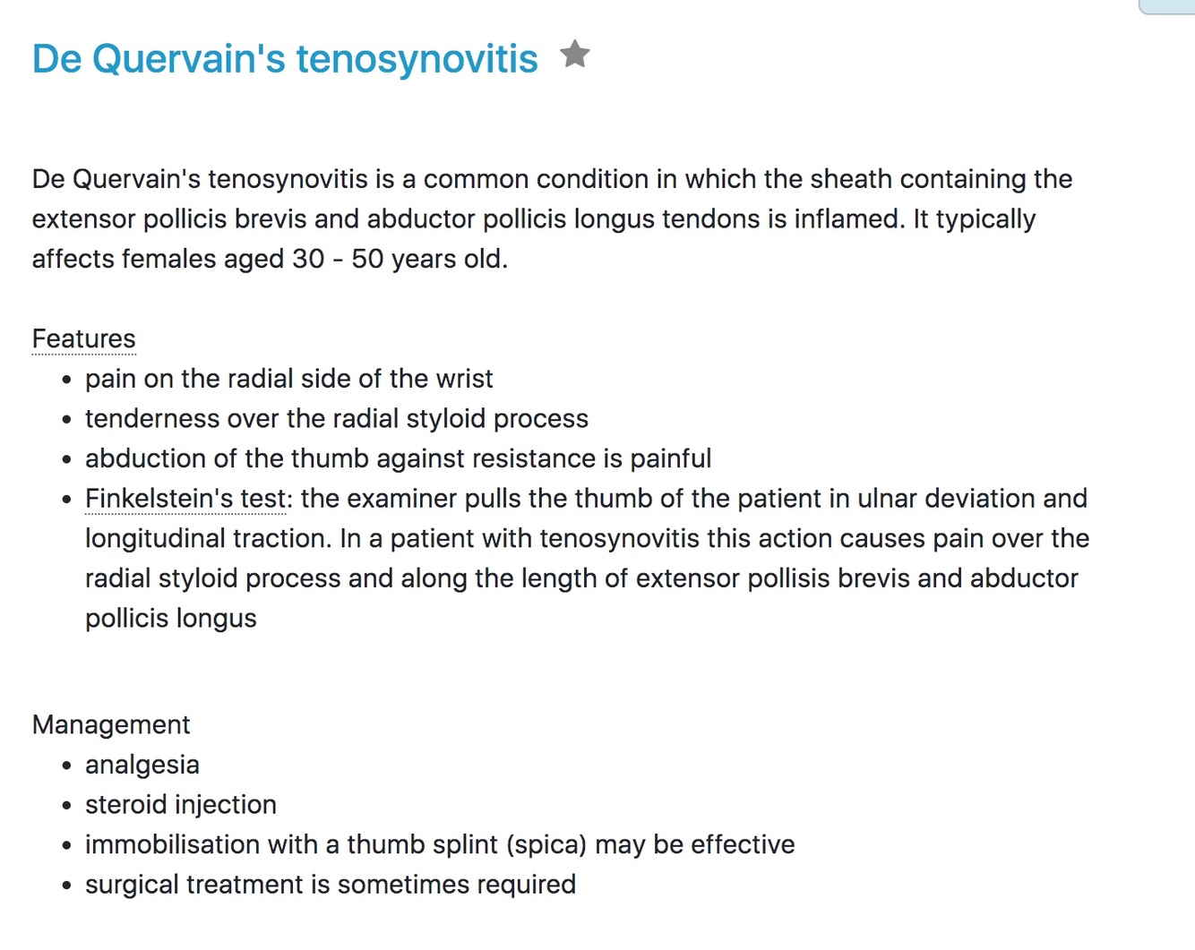 De Quervain’s tenosynovitis features