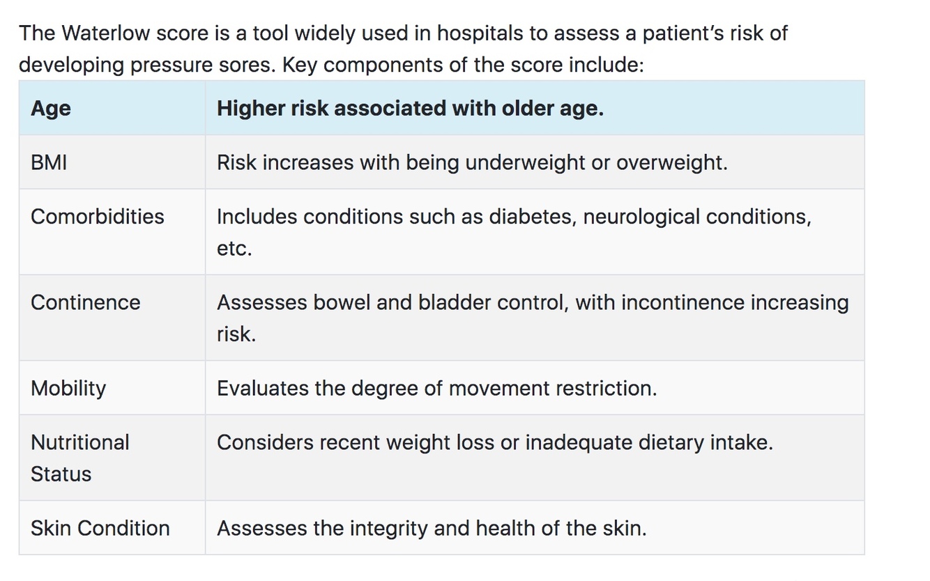 Waterlow score - used to identify patients at risk of pressure sores