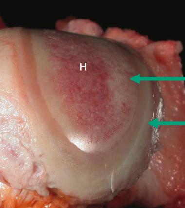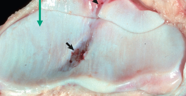 if there is loss of articular cartilage, the subchondral bone experiences more forces and there is a response in accordnce to Wolff’s Law (increased formation and decreased bone resorption), which leads to net bone thickening (sclerosis)–>subchondral bone sclerosis