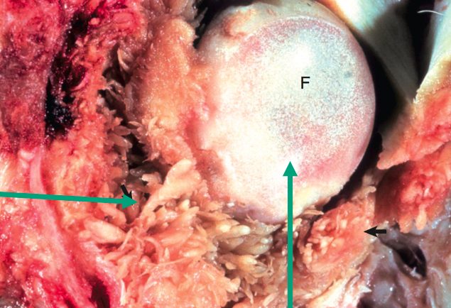 synovial fluid is turbid (pus) and red (hemorrhage), synovial membrane proliferation, fibrin in the joint