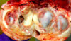complete ulceration of articular cartilage and exposure of subchondral bone, increase in bone density, appears polished from bone to bone contact