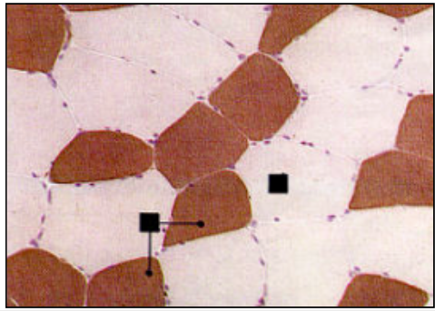 this slide - stained for fibrillar ATPase (DARK BROWN) and greatest in slow twitch with greater number of mitochondria