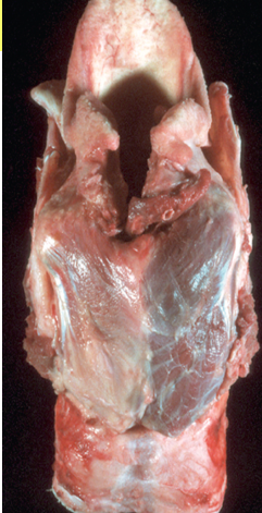 laryngeal hemiplasia due to denervation (can see atrophy of left circoaretynoideus muscle)