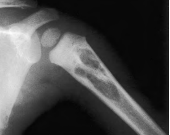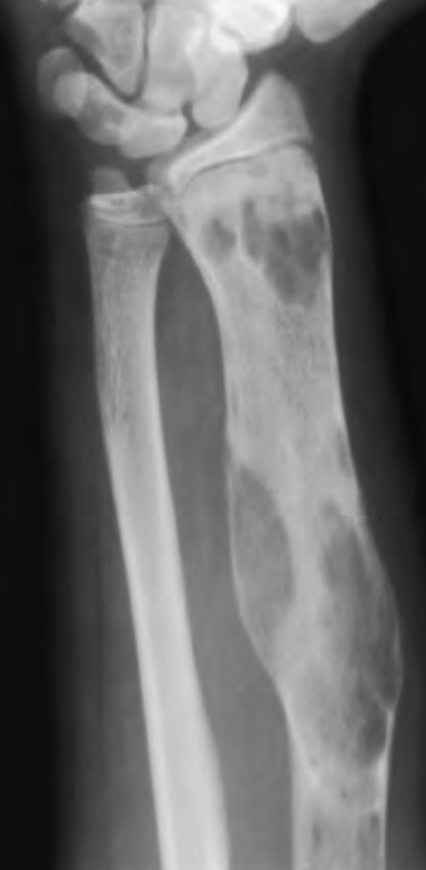 Lesão lítica alongada, com aspecto em “vidro fosco”, zona de transição curta, focos de esclerose, localizada em osso longo