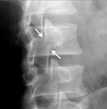 Spondylolisthesis: fracture + slipping of one vertebral body on another