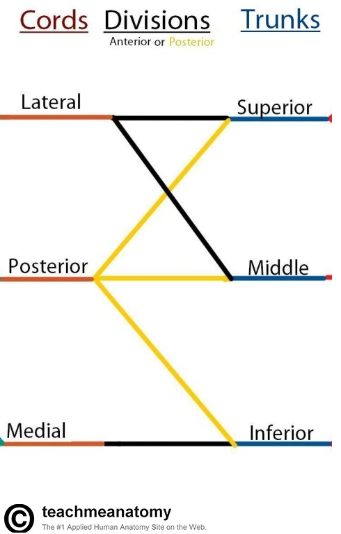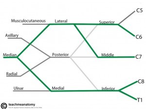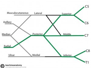 Originates from anterior rami (divisions) of cervical vertebral nerves C5, C6, C7 and C8, and of the first thoracic vertebral nerve, T1