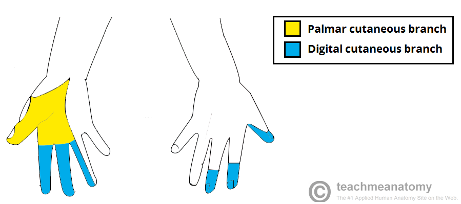Gives off the palmar cutaneous branch, which innervates the lateral part of the palm, and the digital cutaneous branch, which innervates the lateral three and a half fingers on the anterior (palmar) surface of the hand.