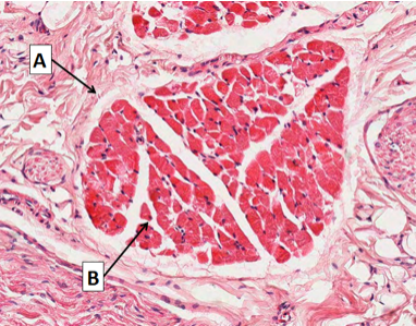 What is the name of the layer of thin connective tissue that surrounds individual muscle fibres, such as shown at ‘B’?
