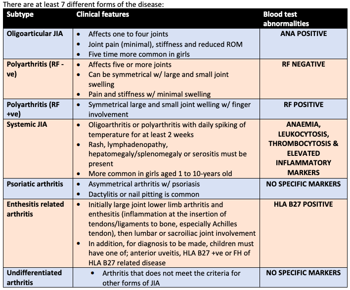 What are the 7 different types of juvenile idiopathic arthritis?