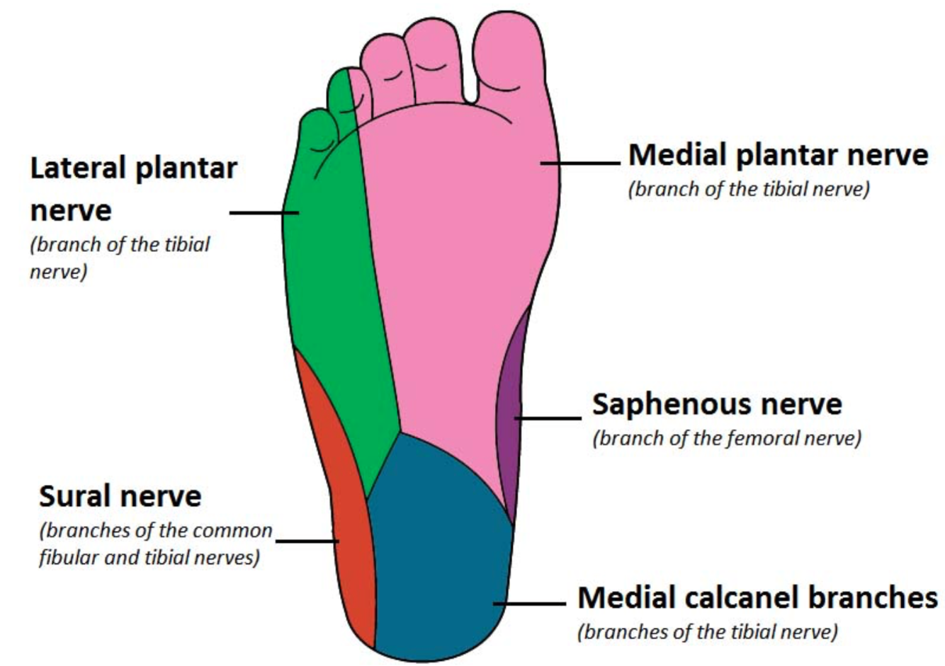 Medial plantar nerve: Innervates the plantar surface of the medial three and a half digits, and the associated sole area.