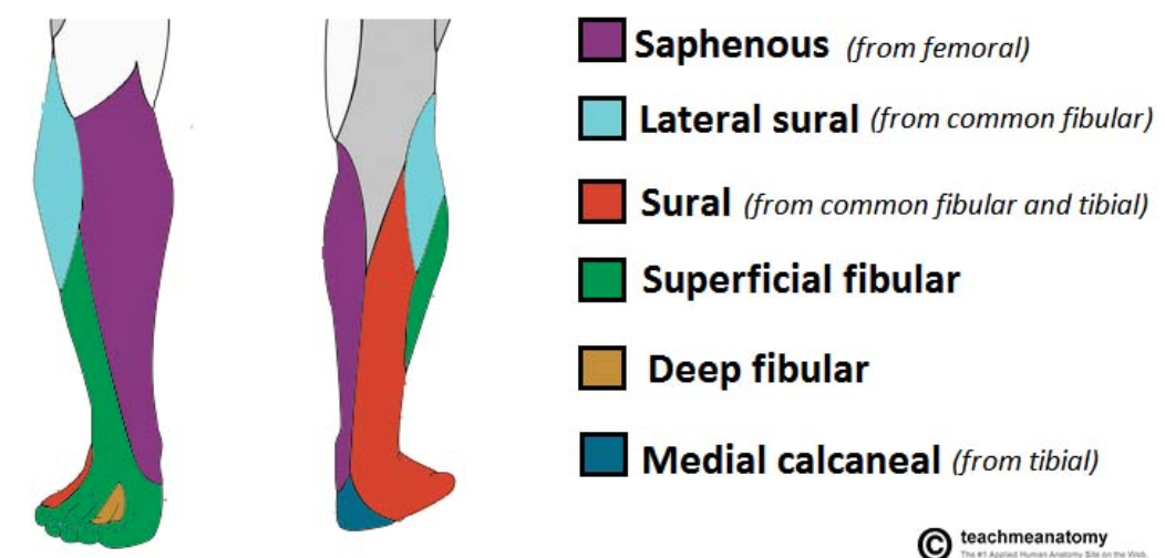 loss of sensation over the dorsum of the foot, and lateral sideof the leg. Innervation is preserved on the medial side of the leg (supplied by the saphenous nerve, a branch of the femoral), and the heel and sole (supplied by the tibial nerve, a branch of the sciatic)