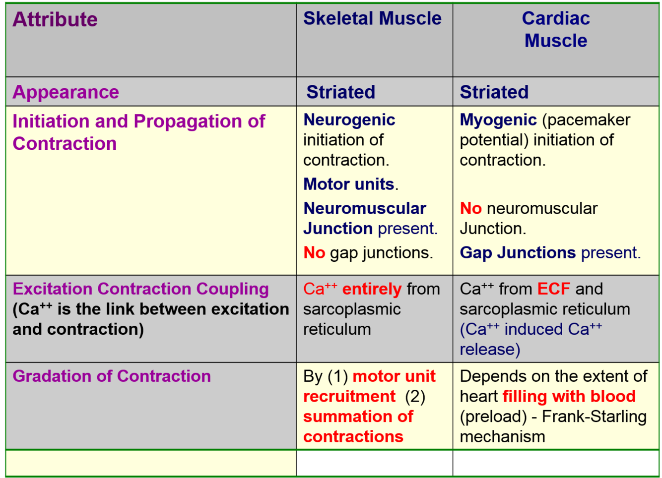 Look at the table to note some of the differences between skeletal and cardiac muscle