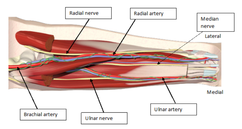 Both the ulnar nerve and ulnar artery descend close to each other down the medial aspect of the forearm