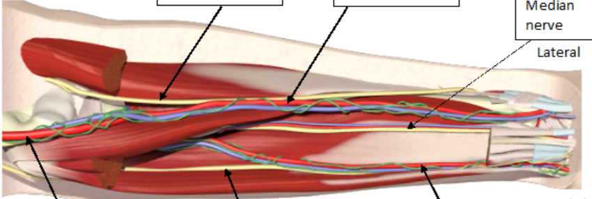The median nerve enters the forearm medial to the brachial artery. It then heads under the pronator teres muscle and passes down the forearm between the FDS and FDP.