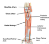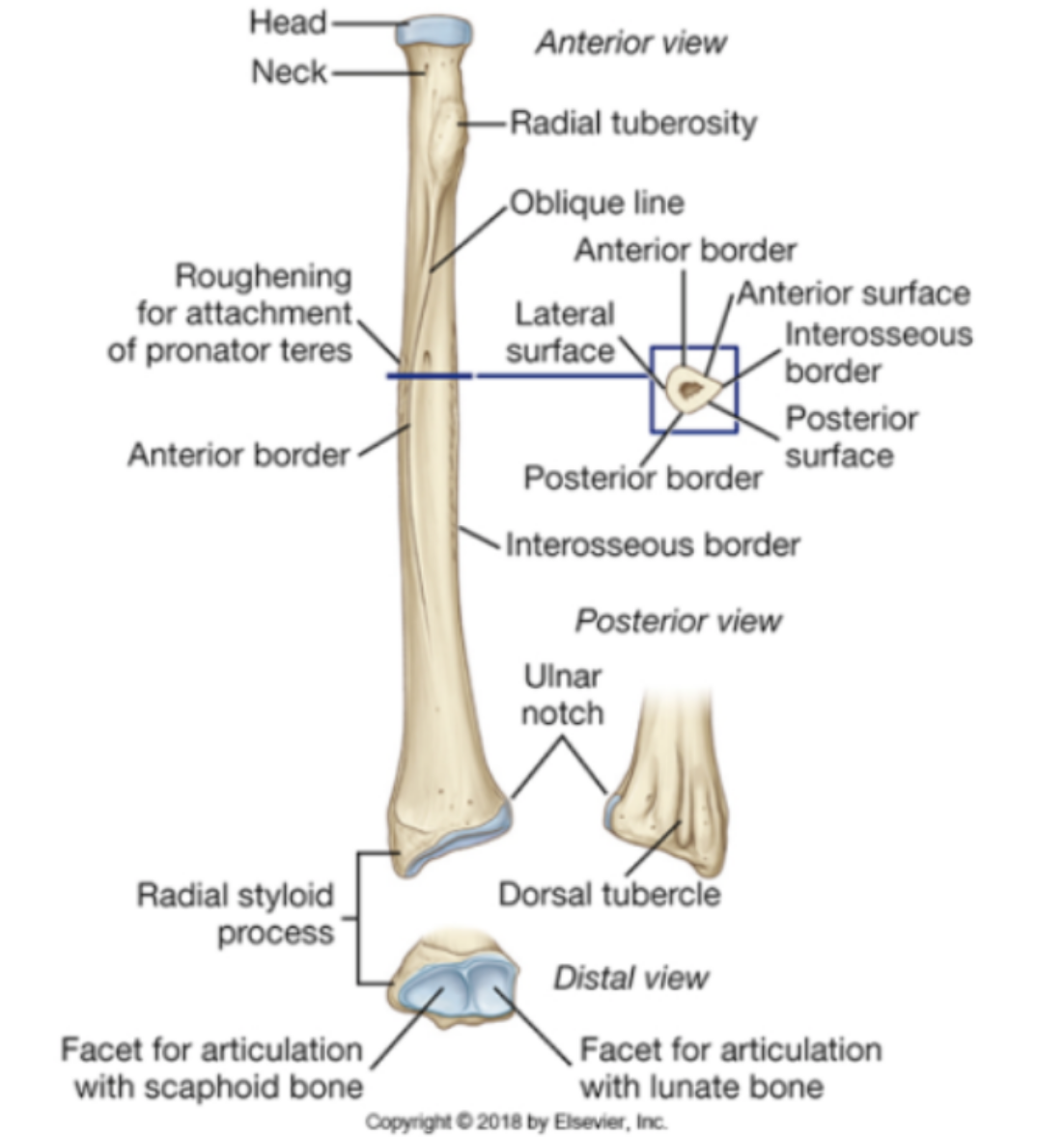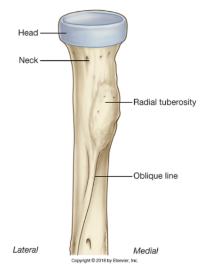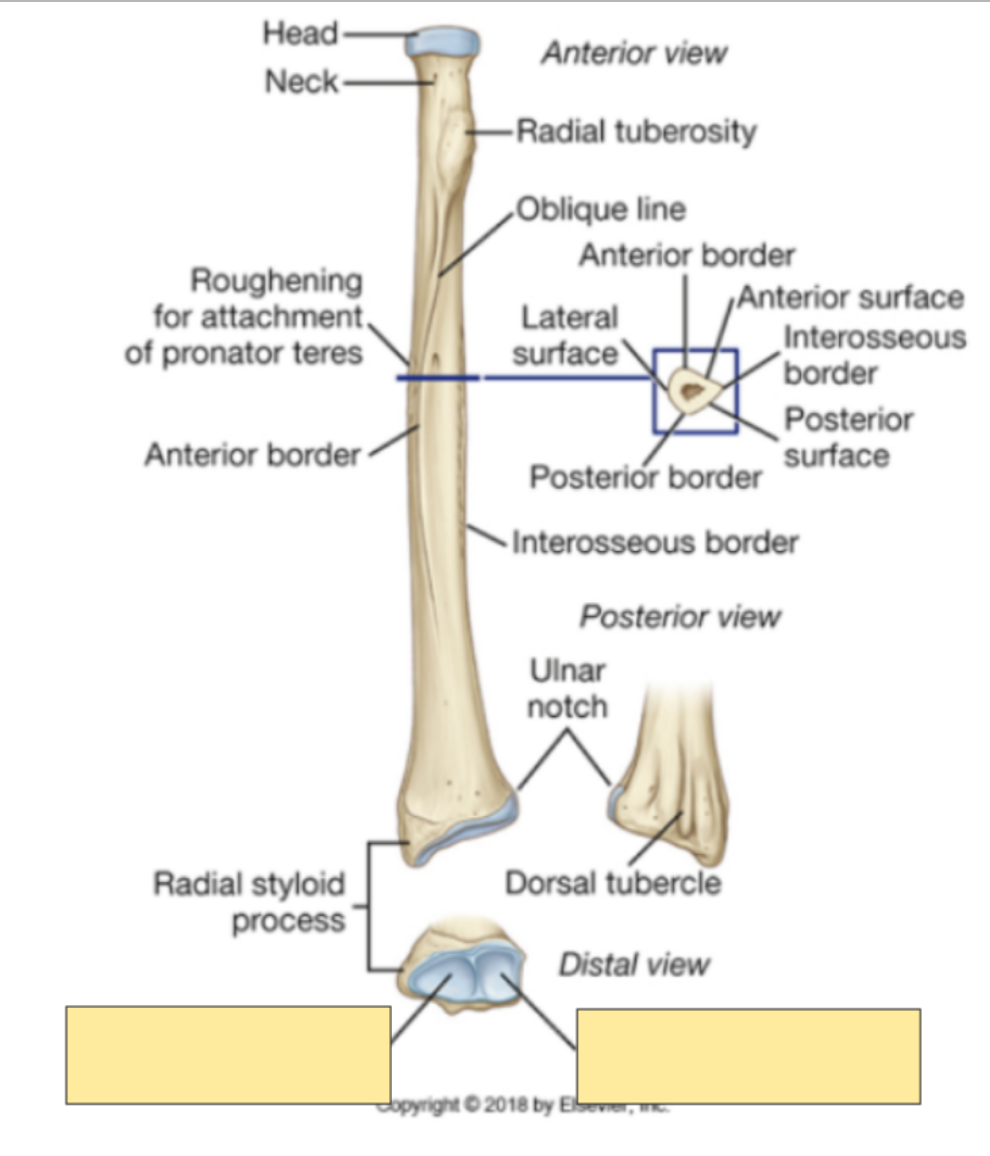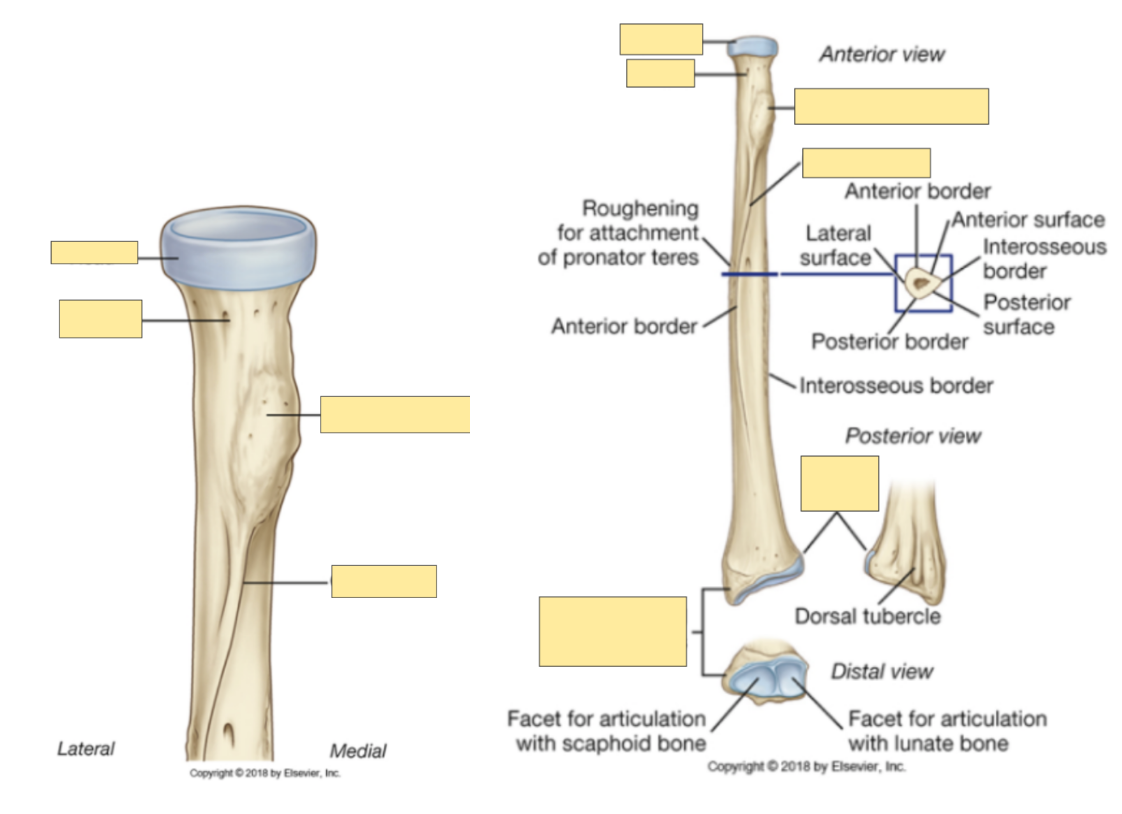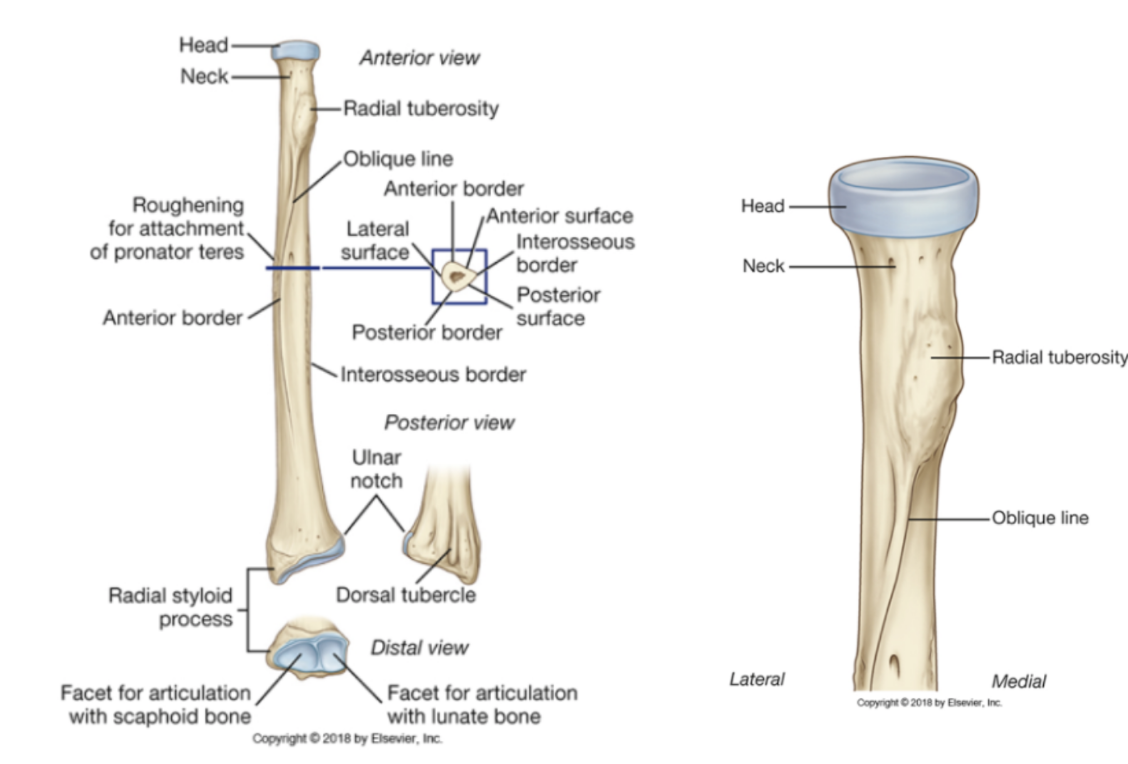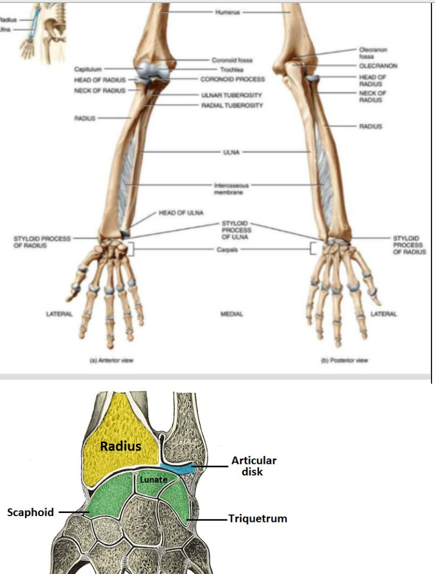 Distally articulates with head of ulna and carpal bones (scaphoid and lunate articular facets)