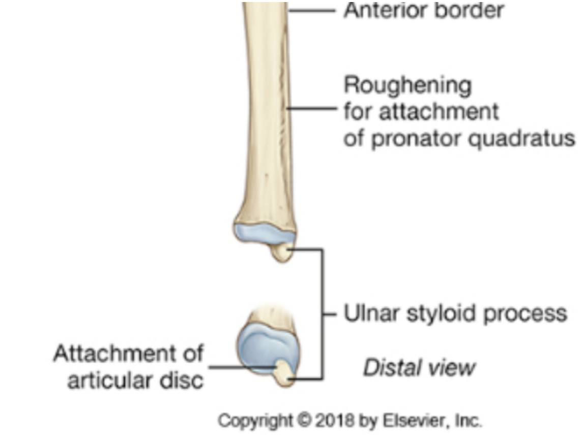pointed projection on lateral surface of ulnar head which allows for attachment of different ligaments