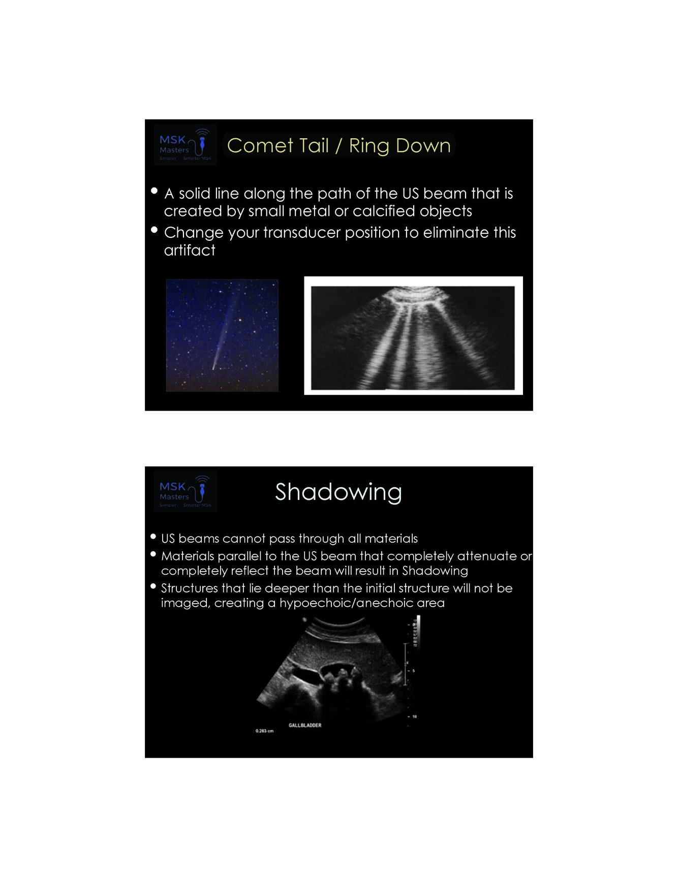 solid line along the path of the US beam that is created by small metal or calcified objects