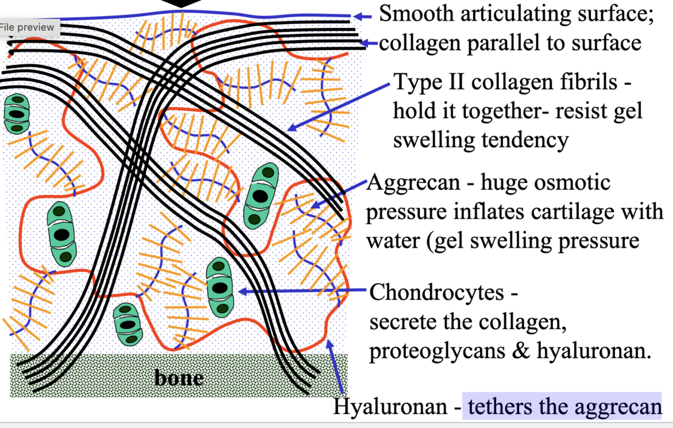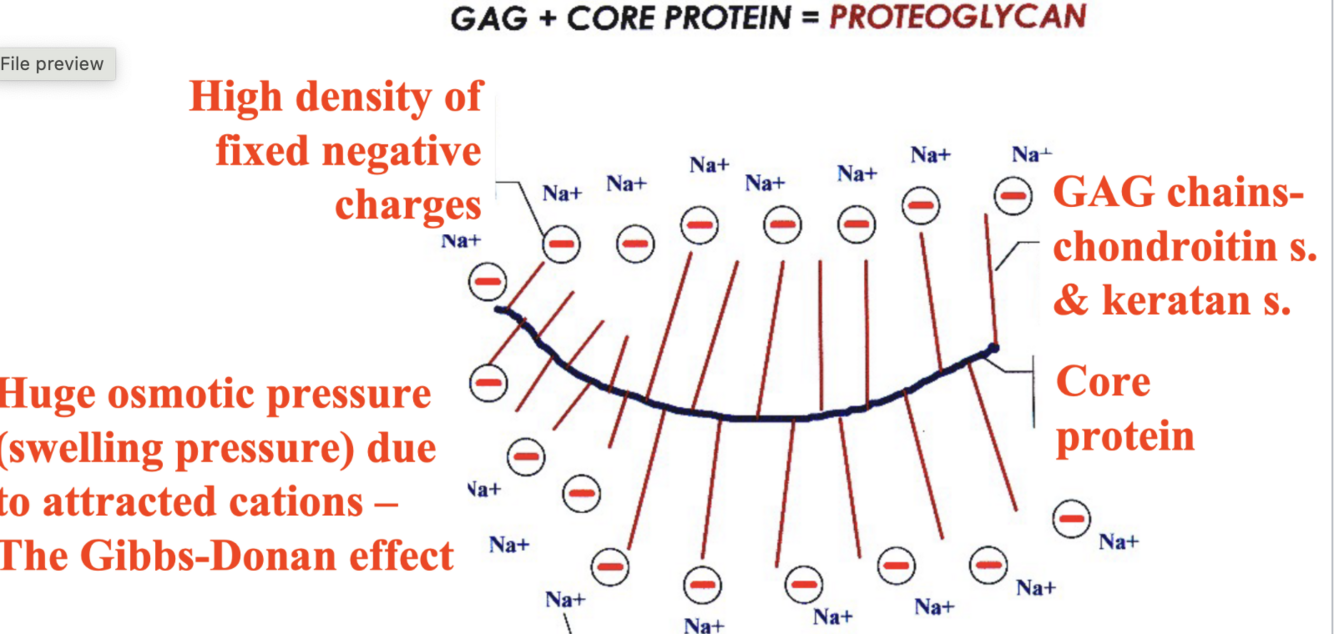 Aggrecan- huge osmotic pressure inflates cartilage with water (gel swelling pressure