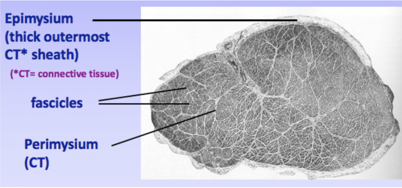 Epimysium: protective outer layer, made of collagen, is a connective tissue