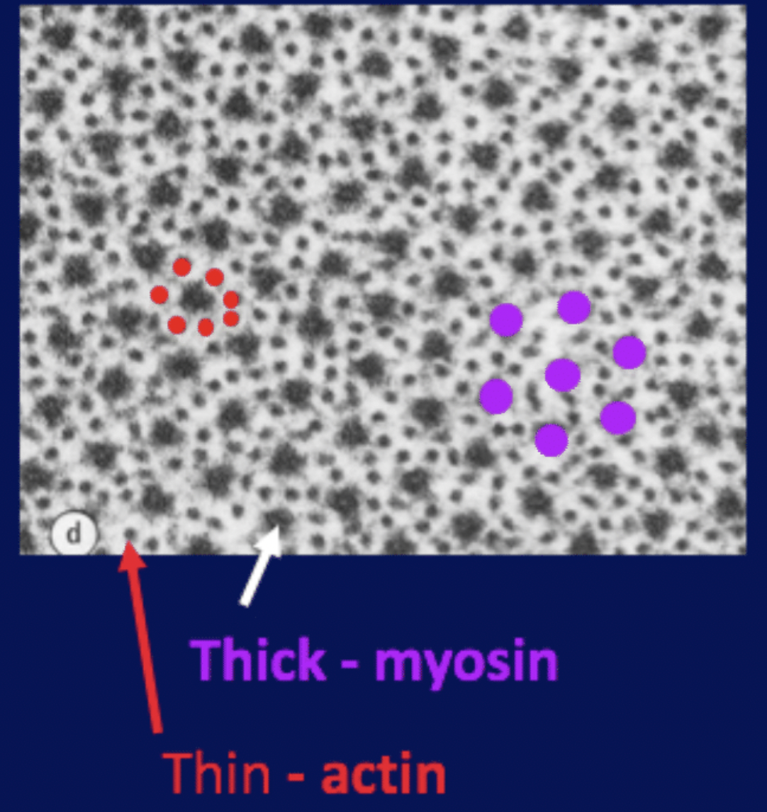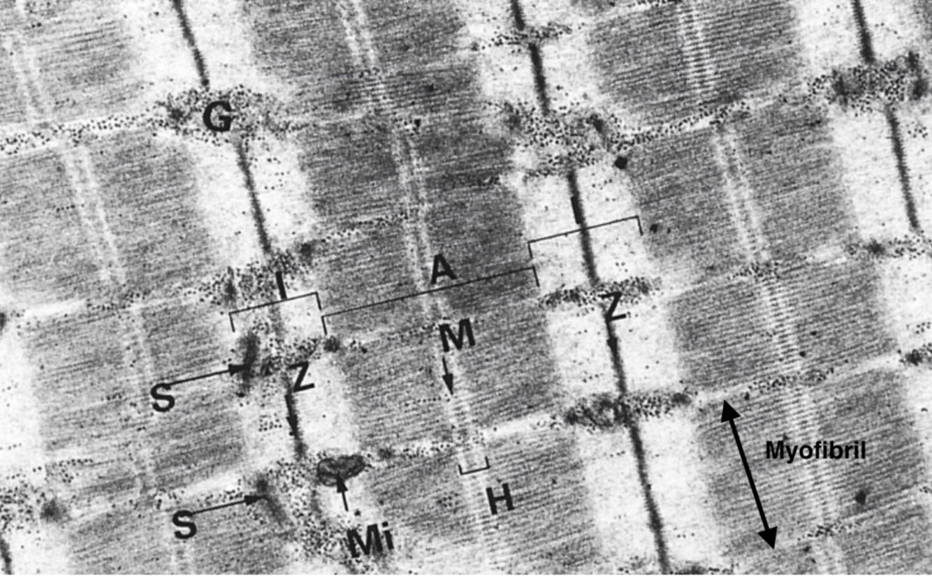 it also shows the existence of thin and thick actin and myosin filaments arranged in bundles, called myofibrils