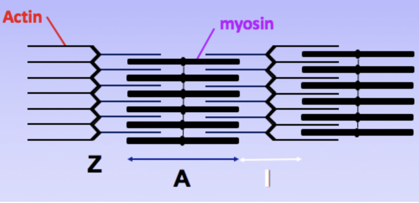 In longitudinal section the actin and myosin filaments line up as shown. A sarcomere is from Z line to Z line. The thick A band is the myosin